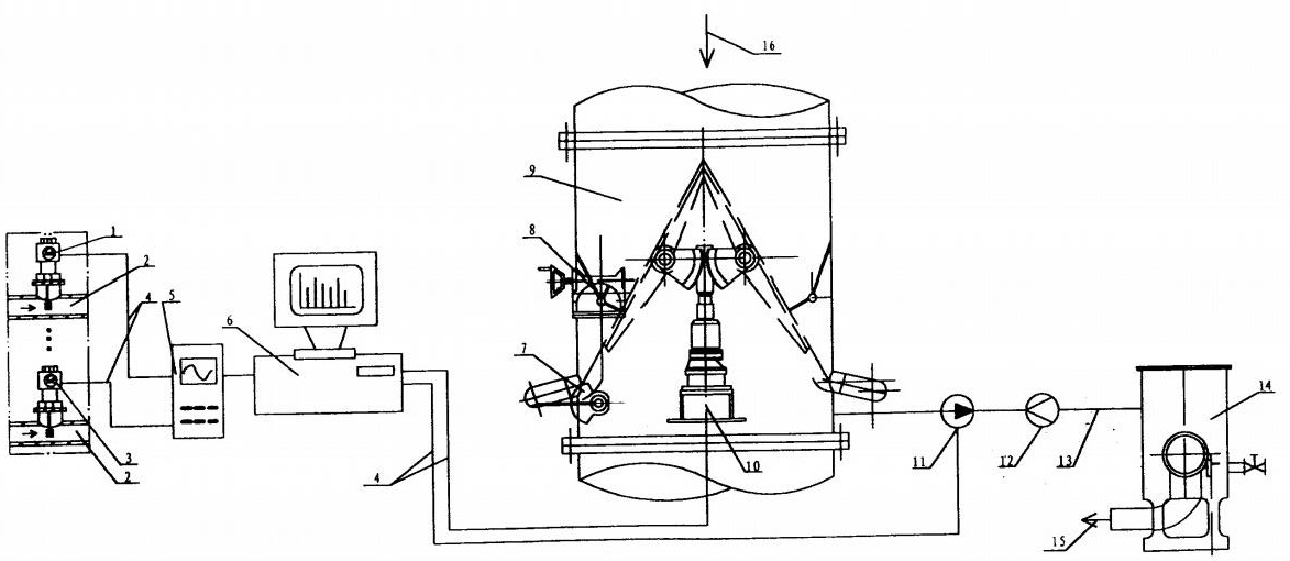 圖中:1、壓力壓差變送器2、凝汽器冷凝水分管道3、溫度測量變送器4、信號電纜5、污垢熱阻監(jiān)測儀6、多媒體計算機7、出球水量調(diào)節(jié)器8、阻渦流調(diào)節(jié)器9、收球網(wǎng)10、電動執(zhí)行機構11、膠球泵12、防止膠球倒流止回裝置13、管道14、裝球室15、箭頭16、箭頭