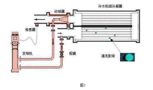 現(xiàn)代冷凝器膠球自動(dòng)在線清洗技術(shù)是一套利用流體、水力機(jī)械、膠球以及微電腦等多種技術(shù)來達(dá)到最簡(jiǎn)單的清洗解決方案,在冷水機(jī)組冷凝器冷卻水的進(jìn)出管安裝發(fā)球機(jī)和捕球器,用特殊配方和結(jié)構(gòu)的橡膠海綿球按一定的循環(huán)程序,在水力的作用下通過冷凝器換熱管擦去管內(nèi)壁上初期形成的沉積物。