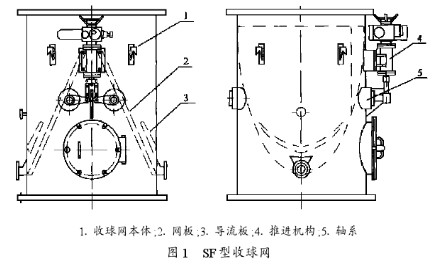 近幾年來,黃埔電廠、漳澤電廠、蘭州第二熱電廠等多家電廠均進(jìn)行了設(shè)備改造,改造后的設(shè)備運(yùn)行良好,收球率可達(dá)95%以上。改造后的收球網(wǎng)采用SF型,如圖1所示。1收球網(wǎng)本體;2網(wǎng)板;3導(dǎo)流板;4推進(jìn)機(jī)構(gòu);5軸系圖1SF型收球網(wǎng)改造后的設(shè)備結(jié)構(gòu)大大簡化,采用兩個網(wǎng)板,膠球經(jīng)網(wǎng)板一次匯集即可由引出管引出。網(wǎng)板上存在雜物需要清洗時(shí),將網(wǎng)板置反洗位。