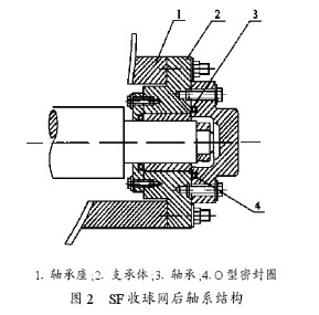 (4)傳動機(jī)構(gòu)老產(chǎn)品的各個網(wǎng)板分別由各自的執(zhí)行機(jī)構(gòu)控制,在實(shí)際運(yùn)行中容易出現(xiàn)不同步。老產(chǎn)品所用的電動執(zhí)行機(jī)構(gòu)自鎖性能也較差,不能控制網(wǎng)板平穩(wěn)準(zhǔn)確轉(zhuǎn)動,在實(shí)際運(yùn)行中時(shí)常發(fā)生兩個網(wǎng)板沒有同時(shí)與外殼內(nèi)壁貼緊,出現(xiàn)漏球。改造后,收球網(wǎng)兩個網(wǎng)板由同一個執(zhí)行機(jī)構(gòu)控制,又采用了大減速比的螺旋執(zhí)行機(jī)構(gòu)推進(jìn),動作平緩,自鎖性好,解決了網(wǎng)板不同步問題。在設(shè)備運(yùn)行時(shí),網(wǎng)板受到水流沖擊也不會發(fā)生抖動。1軸承座;2支承體;3軸承;4O型密封圈圖2SF收球網(wǎng)后軸系結(jié)構(gòu):