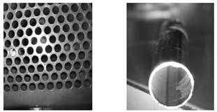 1)現(xiàn)場檢查情況見圖,其中的凝汽器的TP304不銹鋼管內(nèi)壁結(jié)垢普遍,呈深灰褐色,個別管結(jié)垢呈淺藍(lán)色或褐黃色;對凝汽器換管隨機(jī)割管,管內(nèi)水垢分兩層結(jié)垢,外層疏松易脫落;內(nèi)層結(jié)垢緊密,質(zhì)地堅硬,內(nèi)層水垢呈灰白色;