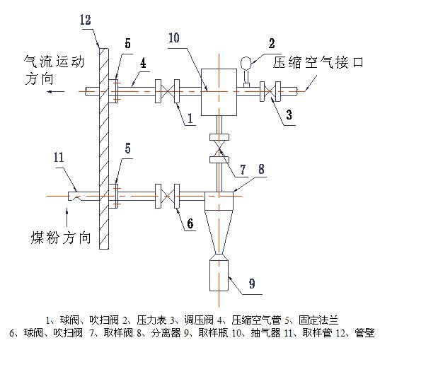 4、取樣閥——飛灰取樣時,將此閥打開,靠壓縮空氣由出氣口排氣形成的氣流,抽吸分離器中的空氣,使其形成負壓,飛灰從取樣口進入取樣裝置,進行取樣。