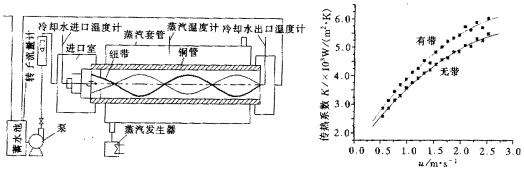 進(jìn)行了銅管內(nèi)安裝冷凝器自動(dòng)膠球清洗裝置前后的傳熱系數(shù)對(duì)比試驗(yàn),試驗(yàn)系統(tǒng)如圖2所示。用水泵抽出水池中的冷卻水,經(jīng)過(guò)轉(zhuǎn)子流量計(jì)測(cè)出流量后,進(jìn)入冷凝銅管帶動(dòng)管內(nèi)的螺旋冷凝器自動(dòng)膠球清洗裝置旋轉(zhuǎn);冷卻水的進(jìn)出口溫度由精密溫度計(jì)測(cè)出;銅管外加熱蒸汽由40kW的蒸汽發(fā)生器供給。改變冷卻水的流速,測(cè)出冷凝銅管內(nèi)安裝冷凝器自動(dòng)膠球清洗裝置前后兩種工況下的傳熱系數(shù)。對(duì)比試驗(yàn)的結(jié)果如圖3曲線所示。