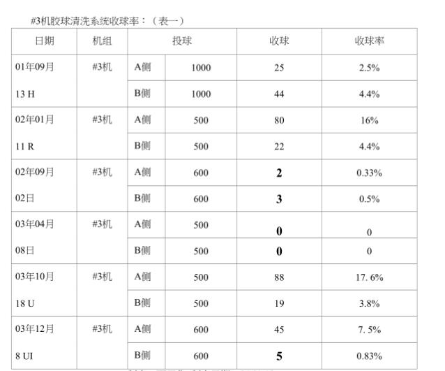 1#3機(jī)膠球清洗裝置系統(tǒng)收球率情況調(diào)查:我們小組把我廠2001一2003年度#3機(jī)膠球清洗裝置系統(tǒng)投、收球情況全部進(jìn)行了核查,發(fā)現(xiàn)收球率實在太低,有時加人幾百個球其至連-個球都收不到,現(xiàn)摘錄其中兒次投、收球數(shù)據(jù),以供大家了解我廠“收球率。