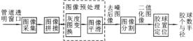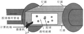 自動(dòng)監(jiān)測(cè)系統(tǒng)示意圖如圖1所示。該系統(tǒng)可以自動(dòng)地監(jiān)測(cè)回收膠球的數(shù)量及其半徑,這樣運(yùn)行人員就可以根據(jù)檢測(cè)結(jié)果適時(shí)地添加或更換膠球,保證膠球的數(shù)量以及質(zhì)量,以期達(dá)到佳的清洗效果。通過多次試驗(yàn),攝像機(jī)的佳有效位置及其范圍得以確定,并根據(jù)強(qiáng)度承受力和光照特點(diǎn)選擇了合適的材料。本系統(tǒng)硬件配置如圖2所示,其中透明管道材料為鑄造鋼、光學(xué)玻璃,管道內(nèi)側(cè)不同角度裝有頻閃燈,攝像機(jī)拍攝角度垂直于密封玻璃面,拍攝焦距可調(diào)。